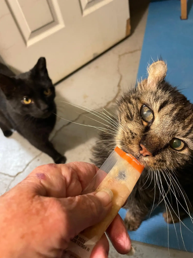 “I was immediately reminded of the cat I grew up with, Callie. She lived to be almost 21, and as she got older, she acquired more health issues (one being kidney disease, which Rufus has). I got to spend Callie’s last three or so years at home with her, and I really enjoyed spending that time being her cuddle buddy,” Luft said. “I’m so glad I got to be there for her as one of her main caretakers. When I saw Rufus, I knew that I wanted to be that person for him, giving him that same kind of love and patience I had for Callie during her last years.”