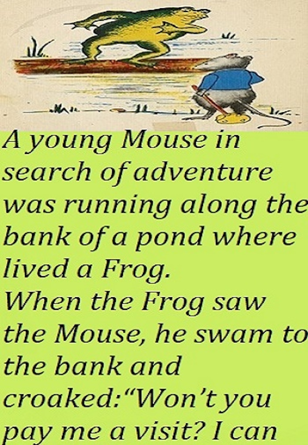 A young Mouse in search of adventure was running along the bank of a pond where lived a Frog.