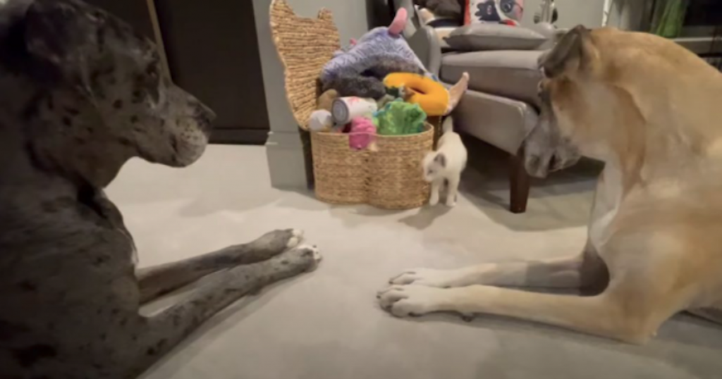 Liberty, Finnegan, and Lucy live up to the “gentle giant” moniker as they carefully play with the cat and treat him as one of the gang!