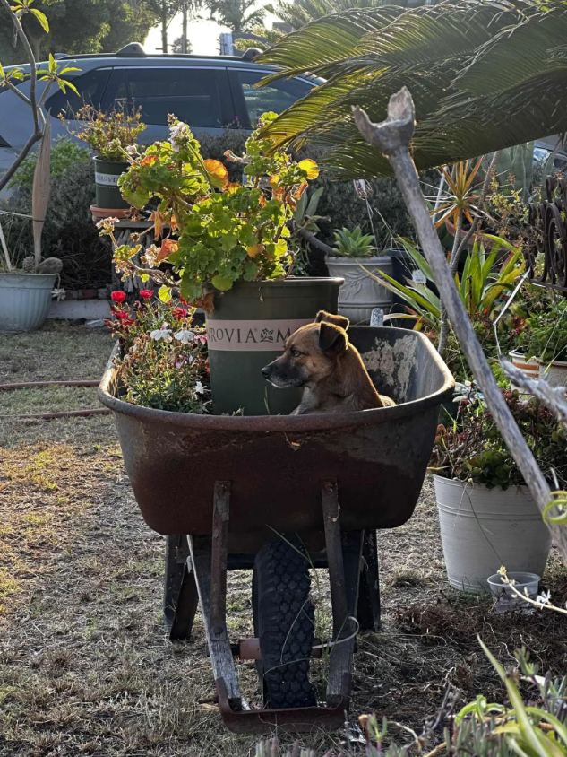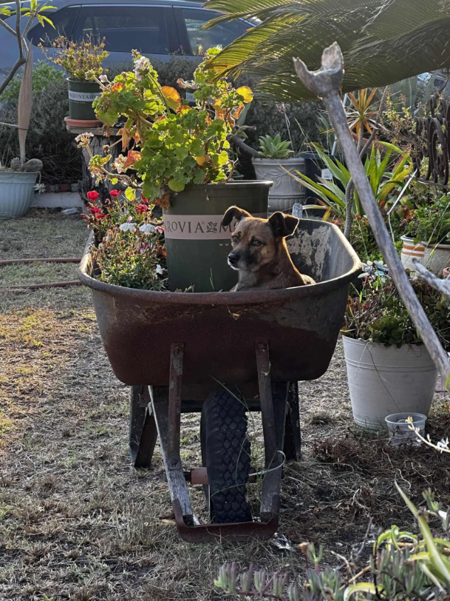 In a bustling Los Angeles neighborhood, a wheelbarrow tucked between flower pots drew unexpected attention. Nestled inside wasn’t gardening supplies, but a small, fluffy dog.