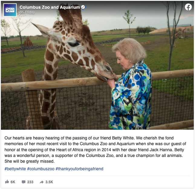 Other zoo organizations paid their own tributes to Betty White. The Columbus Zoo remembered the actress’ visit as the guest of honor at the 2014 opening of their Heart of Africa region, alongside the zoo’s famous director Jack Hanna.