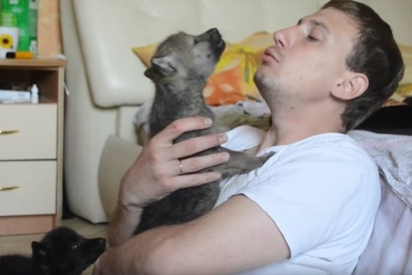 As the man cradles the tiny wolf pup, he starts to imitate a howling noise ever so gently. He caresses the little wolf and seems to whisper to him.