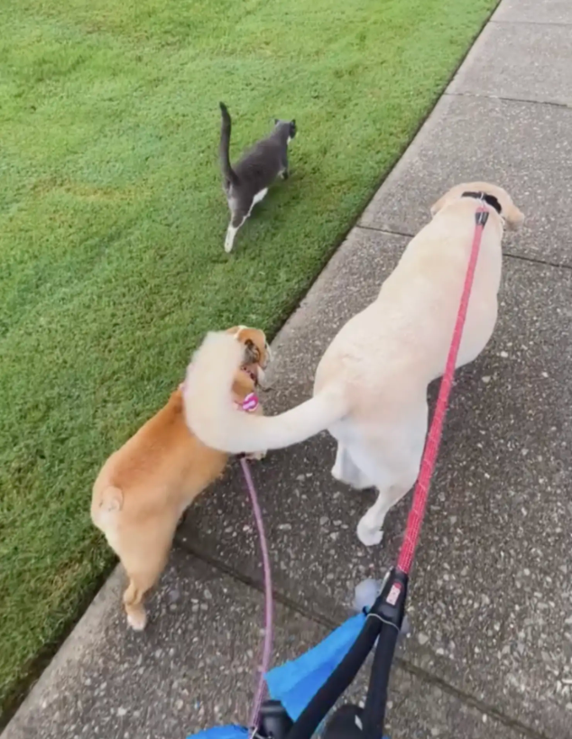 That “someone” is Oliver — the neighbor’s friendly, adventurous cat who has completely fallen in love with Hilarie’s dogs.