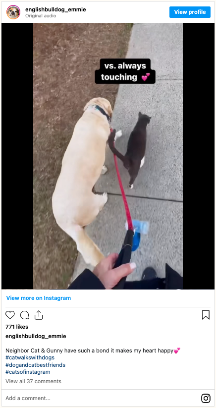 On her Instagram page, you can see video after video of Oliver dashing out to meet the dogs, rubbing against them affectionately, and strutting proudly alongside the pack.