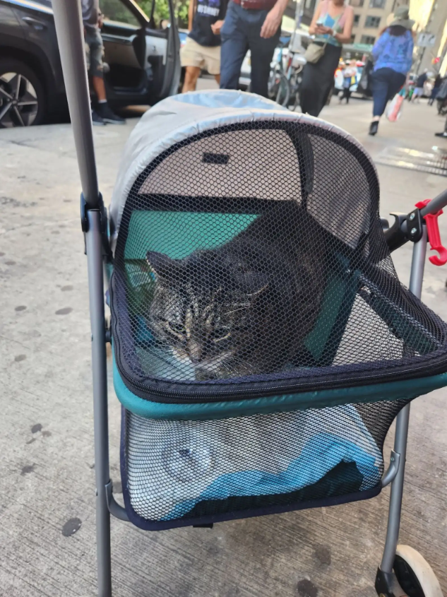 Last week in Midtown Manhattan, a passerby stumbled upon an unusual sight — an unattended stroller parked on the sidewalk. Inside wasn’t a baby, but a fluffy senior cat.