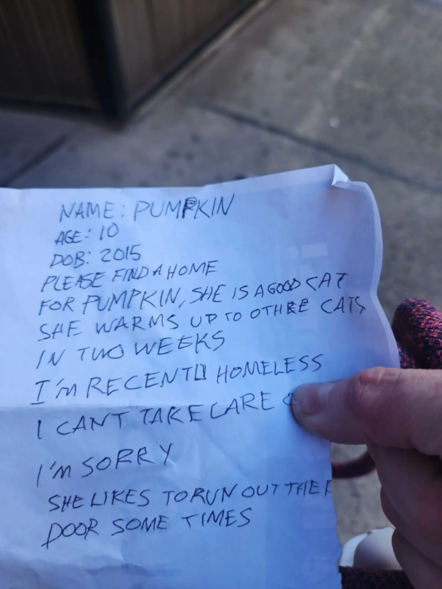 “Please find a home for Pumpkin, she is a good cat,” it read. “She warms up to other cats in two weeks. I’m recently homeless, I can’t take care … I’m sorry.”