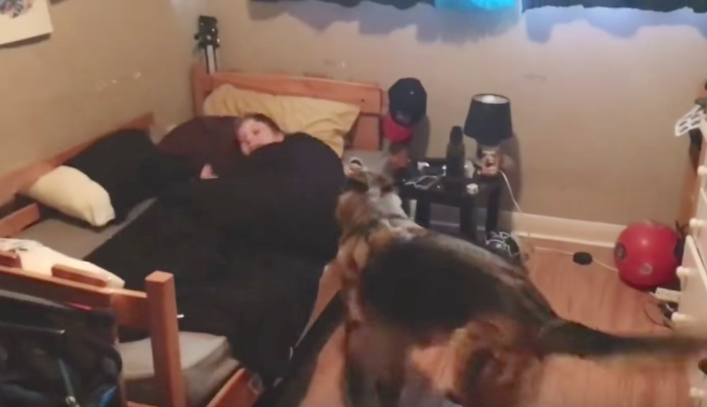 The dog will take off running into each kid’s room and proceed to jump onto their beds while barking her head off!