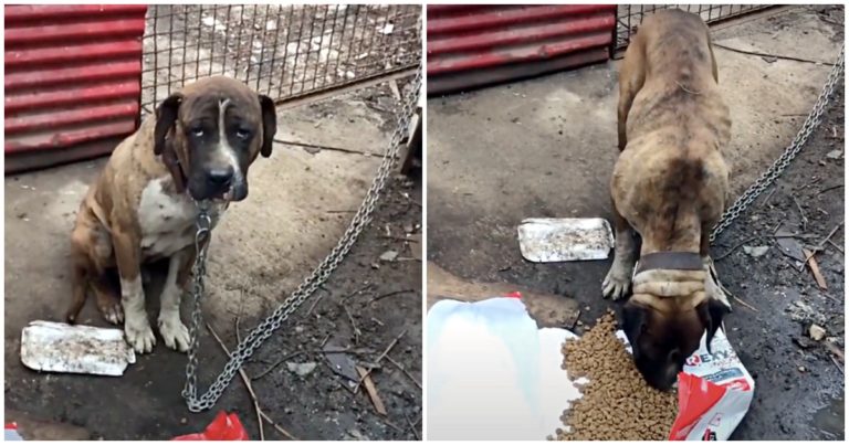 They were shocked to discover a dog who was tied to a tree outside with an extremely heavy chain. His owner ignored him and never fed him.