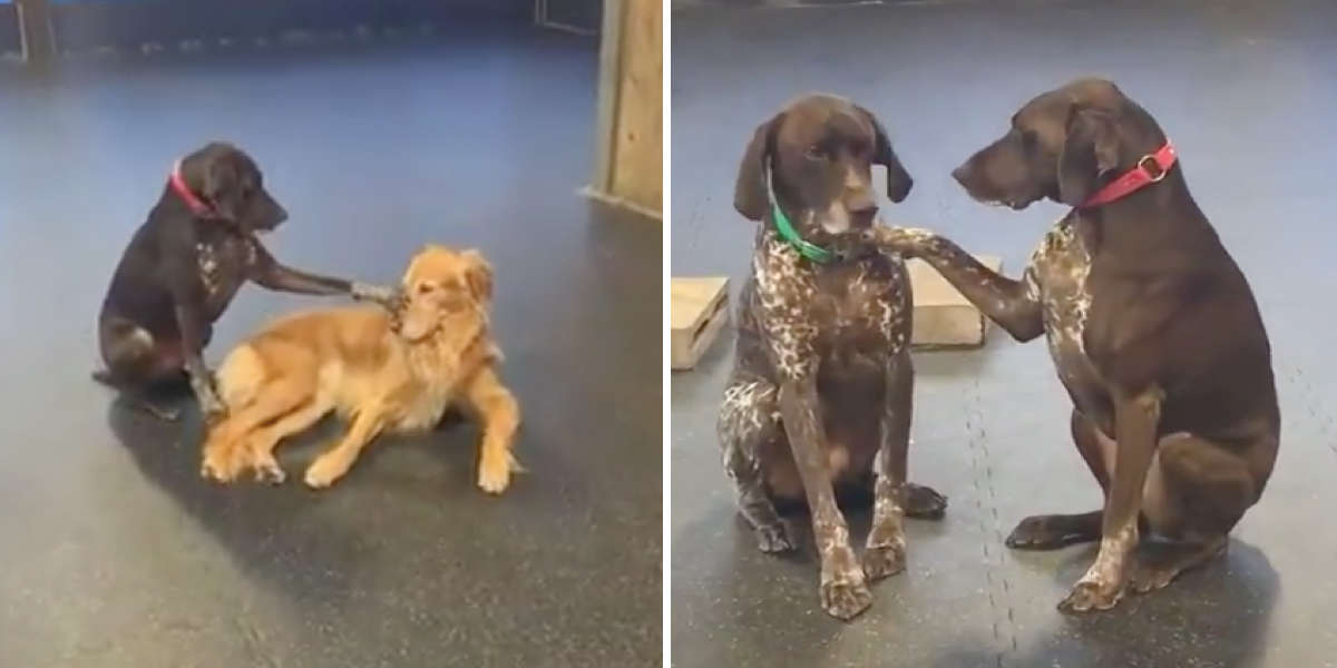 Pawing at other dogs is typically a way of showing submission or instigating playtime, but Ruby seems to just be interested in giving the pups a little scratch on their heads or backs.