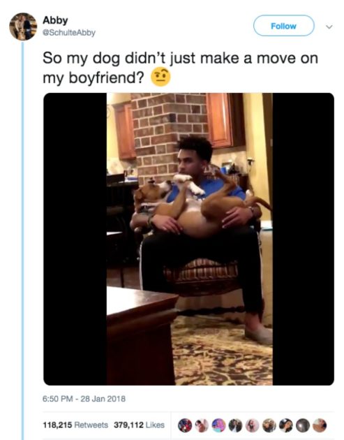 Abby found the moment so funny that she captioned the video, “So my dog didn’t just make a move on my boyfriend?”