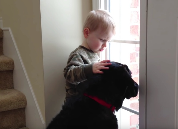 Burt sat near the front door, staring longingly for his family. As he looked outside, the adorable toddler came over to give his furry friend some comfort and reassurance.