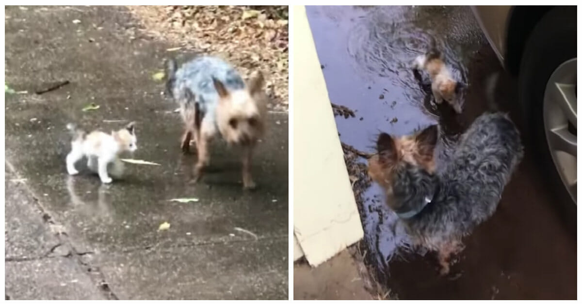 The kitten was a stray, and the weather was very rainy. Sensing she had no place to go, the compassionate dog decided to take her in and give her shelter.