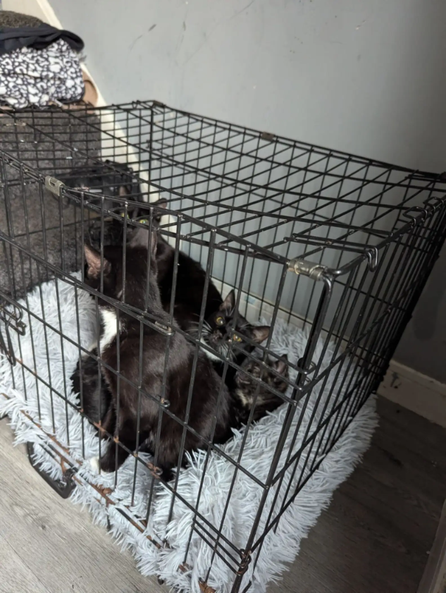 Horrified, the woman ran toward the crate. Inside, she found five black cats — a mother and her kittens — pressed tightly together, shaking with fear.