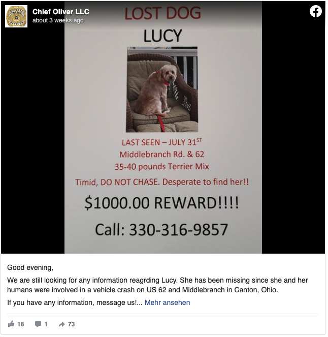 According to an update from the Canton Repository, a Canton local saw Lucy in the street late at night and recognized the dog from social media posts. Then, a “dog whisperer” named Ramona Hartleben and her crew helped capture the dog.