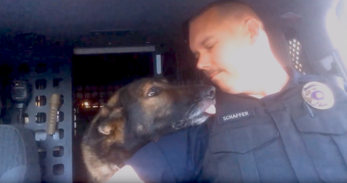 They’d been through it all as a certified Explosives Detection and Patrol duo, but it was time for that to come to an end. As officer Schaffer calls in to honor Faust, the dog reacts with a whimper and a kiss as if he knows exactly what’s going on.