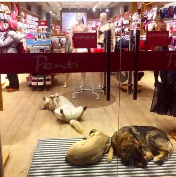 A women’s clothing store called Penti allowed some dogs inside to give them shelter. Here you can see the three dogs taking in the warmth as a customer shops right next to them. 🙂