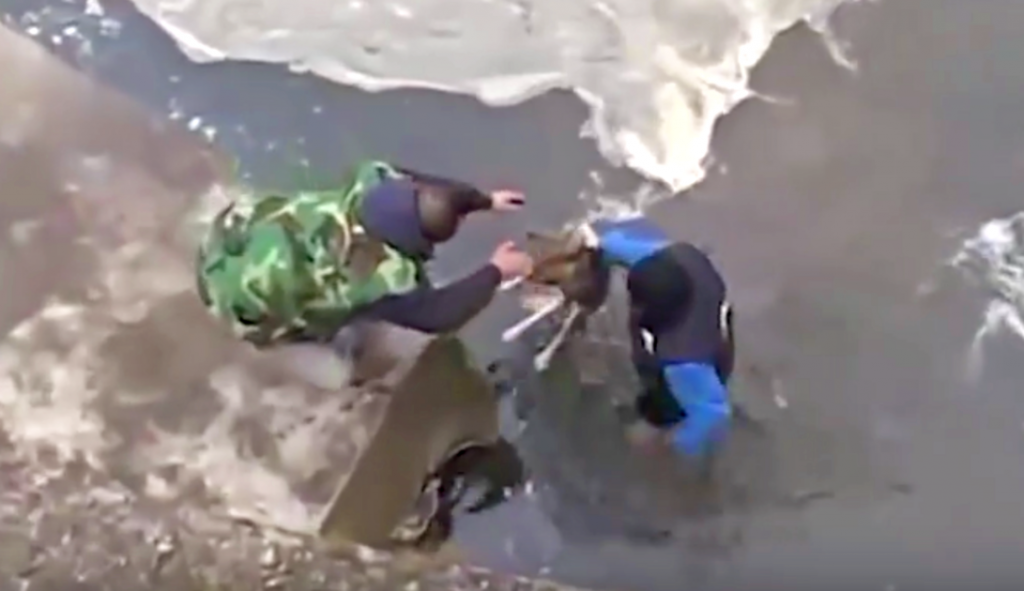 One rescuer jumps into the frigid waters and takes her by the puppy nape, drags her over to the shoreline. The other rescuer is waiting on dry land to receive her. The moment it totally clicks and the puppy realizes she’s being saved, her whole desperate demeanor changes.