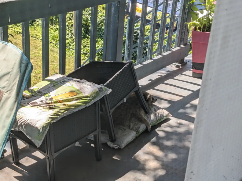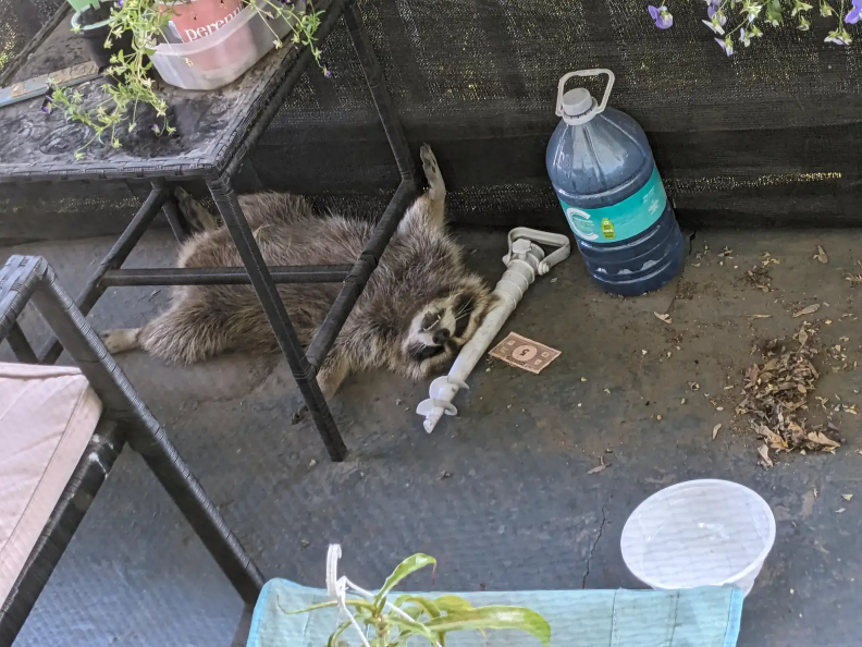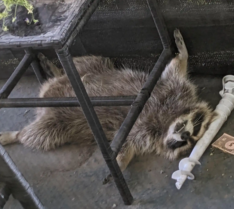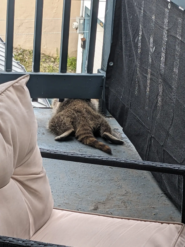 There, stretched out comfortably on the balcony floor, was a raccoon who looked like he’d just finished a long night of adventures.