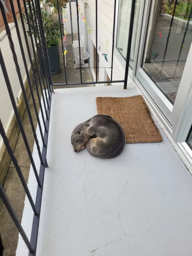 But right there on the porch, nestled beside the doormat, was an unexpected guest: a young fur seal, sound asleep.