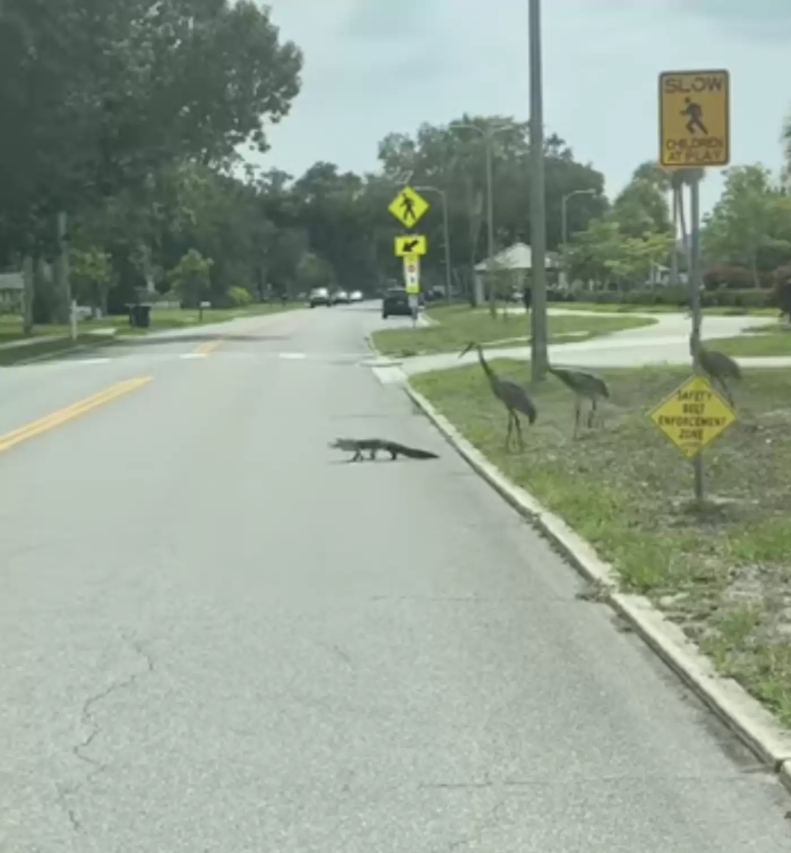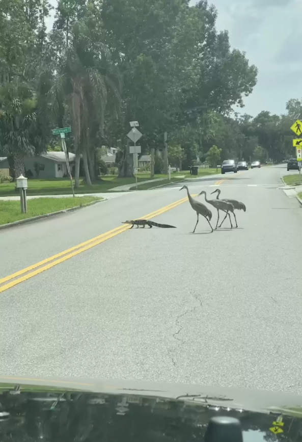 “At first it looked like a game of follow-the-leader,” Neptune said. “But once the alligator got into the street, the cranes actually went ahead of him.”
