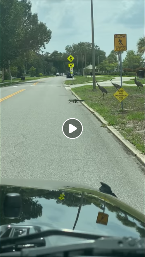 “We see alligators sunning themselves all the time,” she said. “But we’ve never seen one crossing the road — let alone being guided by cranes. It was amazing.”