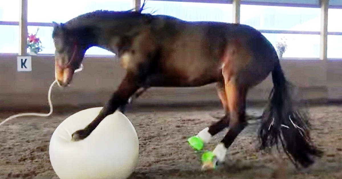 The overwhelmed horse goes nuts with happiness and hilariously runs to caress the ball with his cheek.