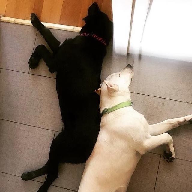 “The Good Samaritan who found them and who lives in a country where dogs are not safe, sent them here to Los Angeles to try to find a home where they would never be hurt again. She told us they had deeply bonded to each other. She was right. We have never seen a more deeply bonded pair of dogs. Perhaps it is because of their very traumatic early experience, we don’t know, but they have been inseparable. When one moves, the other moves. They are almost always in physical contact with one another. They are friendly, loving, house-trained young dogs. About 8 months old, 40 pounds.”