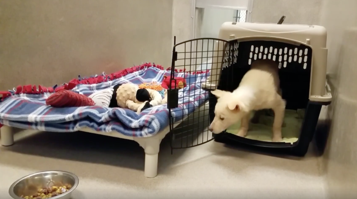 In the video below, Kat had just arrived after a 15-hour flight from South Korea where she was rescued from a dog meat farm. When they opened her crate, the dog just hesitantly looked around and was unsure of what to do with herself. But she’s about to realize her life has changed forever. 🙂