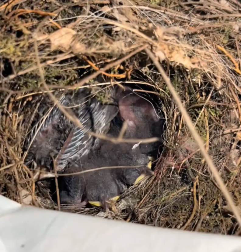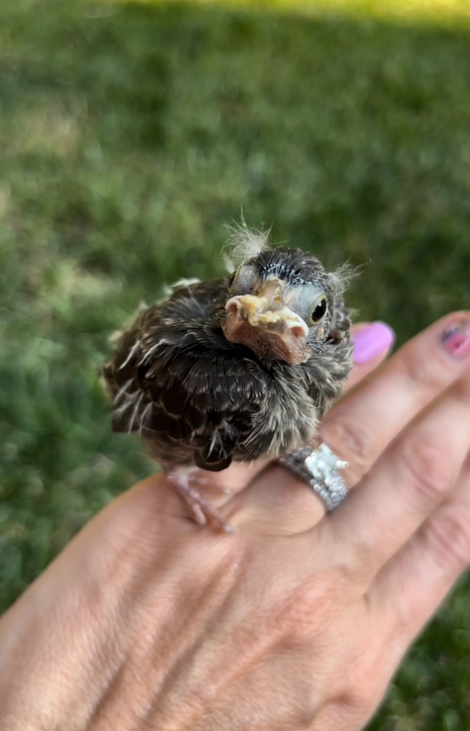 While checking on a bird’s nest in her yard, Starr noticed a baby cowbird trapped in the grates of a wagon. Instinctively, she rushed to help.