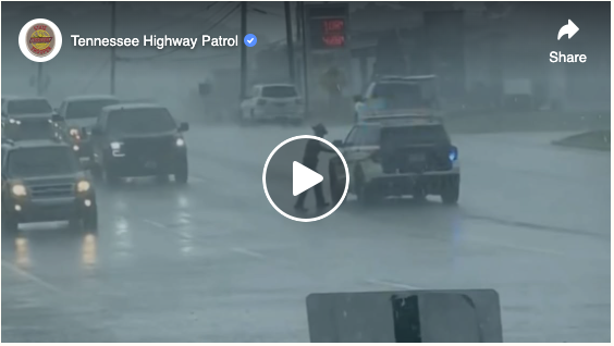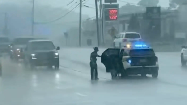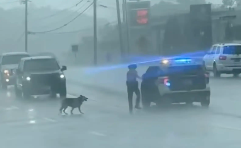 The wind and sheets of water made it nearly impossible for drivers to see clearly, putting the dog at serious risk. But one observant officer sprang into action.