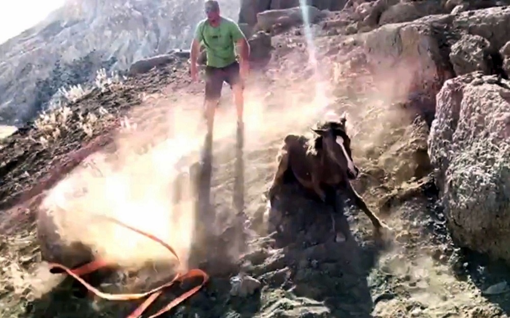 They attached a strap to the front boulder and pulled it with their vehicle. The boulder shifted slightly, but the horse was still trapped.