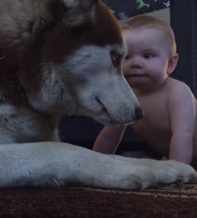 What an incredibly patient pooch to let his little human grab his fur and wobble around him. The baby is truly enamored with this Husky.
