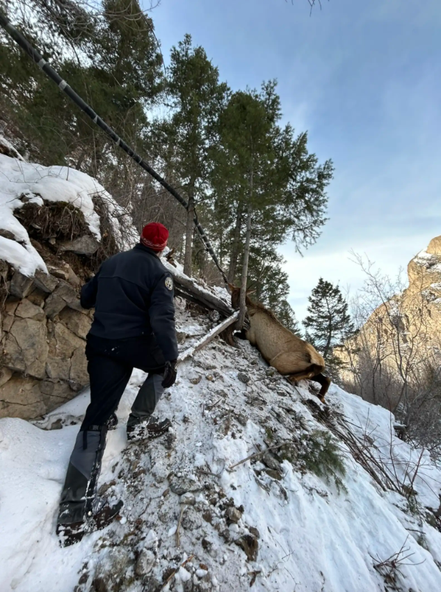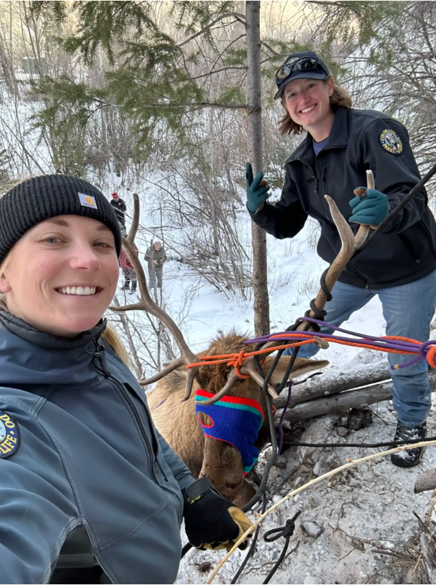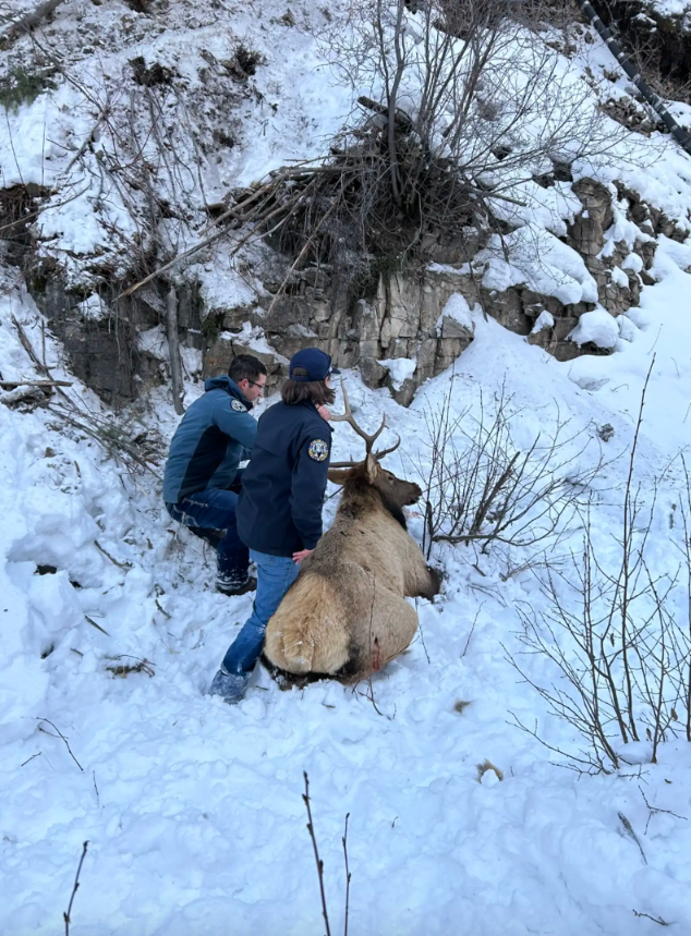 Once sedated, CPW officers worked fast, cutting through the ropes snarled around his antlers. But there was one big problem left: even free of the rope, the elk was still perched on a dangerous icy incline.