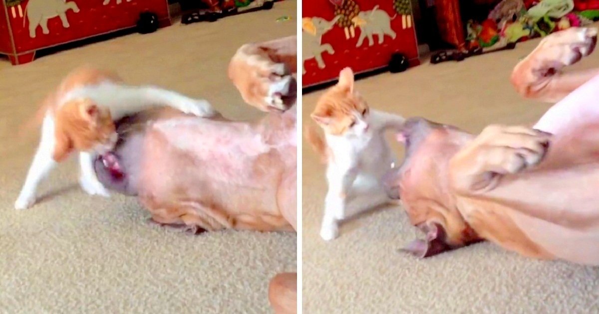 She initiates multiple attacks on the poor Pit Bull, but the Pit Bull meekly takes it all in, and even begs the kitty to stop!