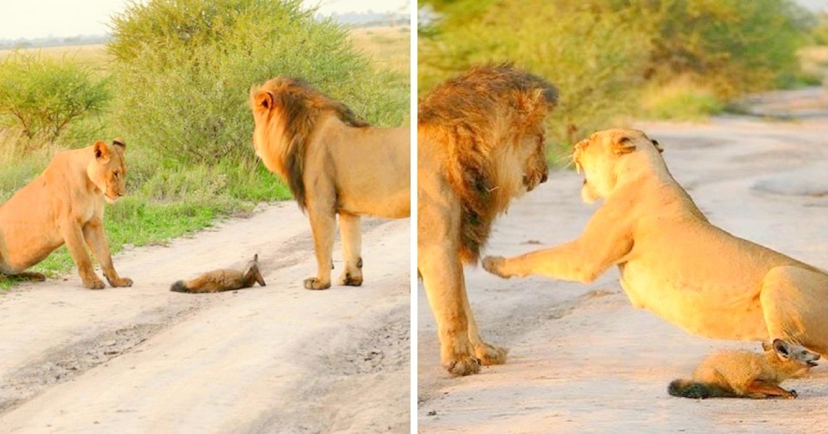 In a strange twist, the lioness’ motherly instincts kick in and she resolves to spare the tiny fox that was unable to defend himself. She stands by the helpless fox and instructs her cubs to not bother him. But this decision isn’t taken well by the other members of the pride.