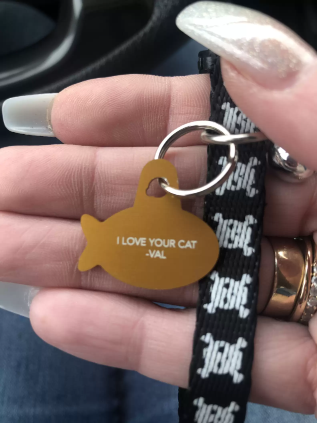 The cheerful visitor began showing up every day, happily soaking up Jonathan’s attention. Valerie suspected he had a family somewhere, so she slipped a collar on him that read, “I love your cat” on one side and “Please call if you own this cat” on the other, along with her number.