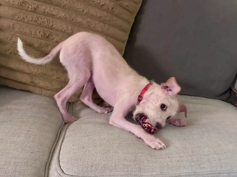 Since that day, Scratchy has been living like royalty in his foster home. He spends his days chasing balls, playing tug-of-war, and soaking up endless snuggles from his foster siblings. His skin has healed beautifully, and his spirit has bloomed.