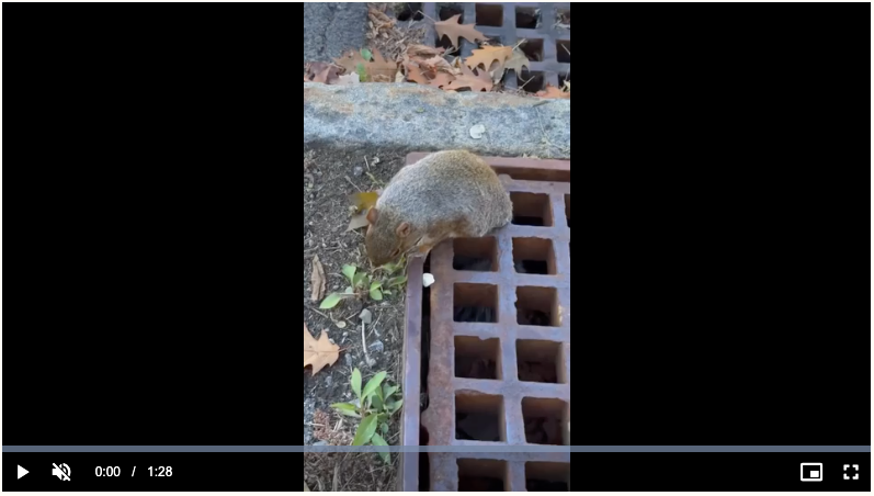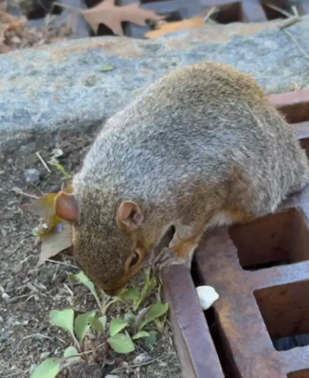 Using it as a prop, she wedged the grate open just wide enough to reach underneath. With steady hands, she slid her fingers under the squirrel and gently worked his tail free.
