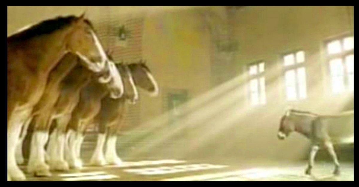 In the video, the donkey sets his sights on strutting with the big guys, and in this commercial, he outlines his game plan to become one of them. The donkey explains his goal and states the obvious: he wasn’t born a Clydesdale. But he also isn’t going to let that interfere with his dreams.