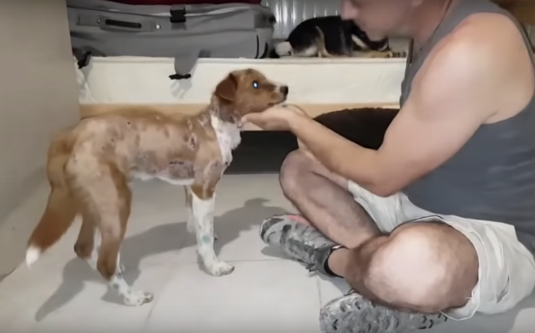 Volunteers with the Takis Shelter came to see the dog. They were saddened to see he was merely a puppy. No creature deserves this… but a baby? WHY??? The poor puppy was in a state of shock. They gave him a name, Ozzy.