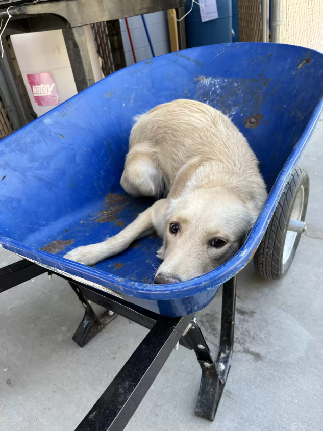 One of those dogs was Darla — a shy, 8-month-old golden retriever who was too frightened to even stand. When the staff tried to lead her down the hallway, her trembling legs gave out. So, with heavy hearts, they placed her in a wheelbarrow and began to push her forward.