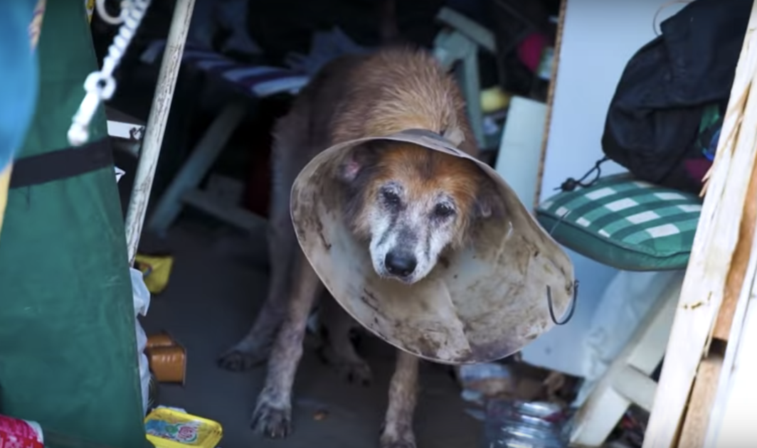 It smelled and was extremely unsafe. A dog, named Pepa, made her way over. She had a filthy cone on to prevent her from attacking her own body.