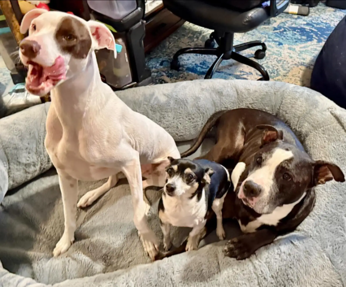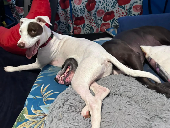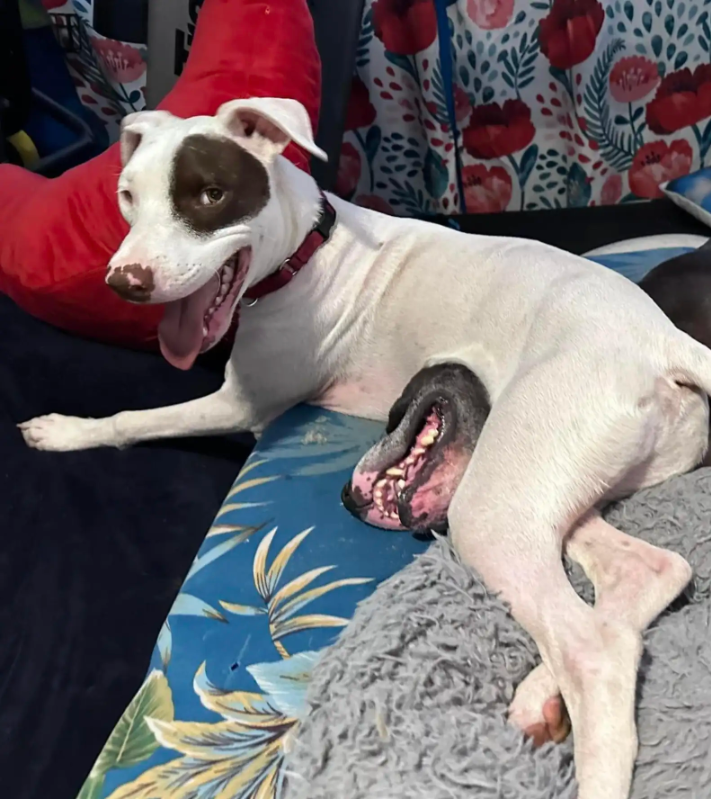 The “stomach mouth” is actually just the head of another dog resting on Smiley, a cheerful rescue pup. Smiley’s beaming face — once a symbol of despair — is now the center of joy in his family.