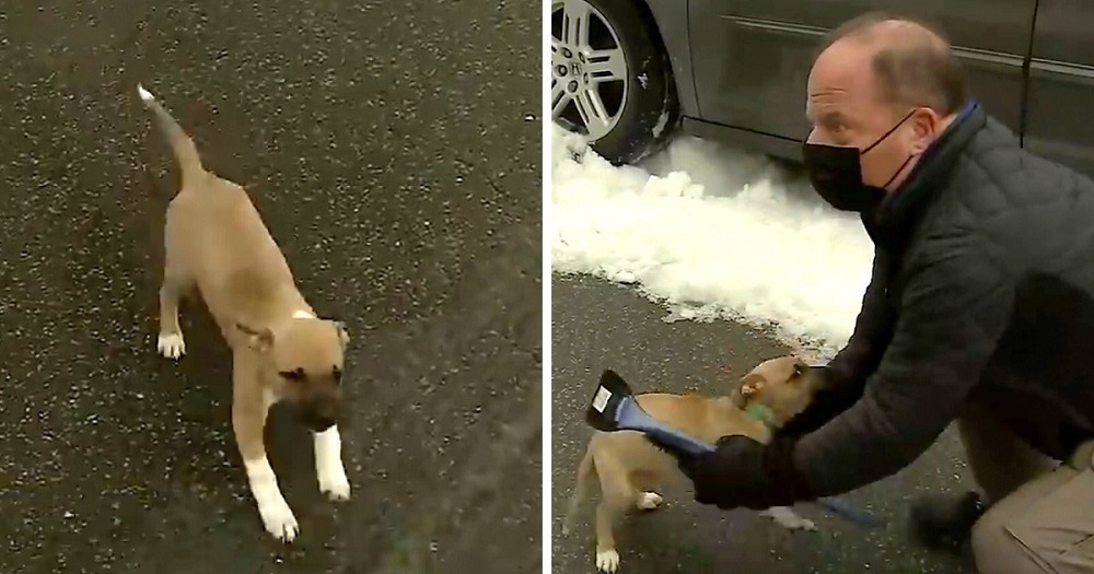 Bob was scraping the ice off of random cars when a tiny puppy casually entered into the camera frame. The puppy was freely strolling on the road, so Bob picked her up to protect her from possible oncoming cars.