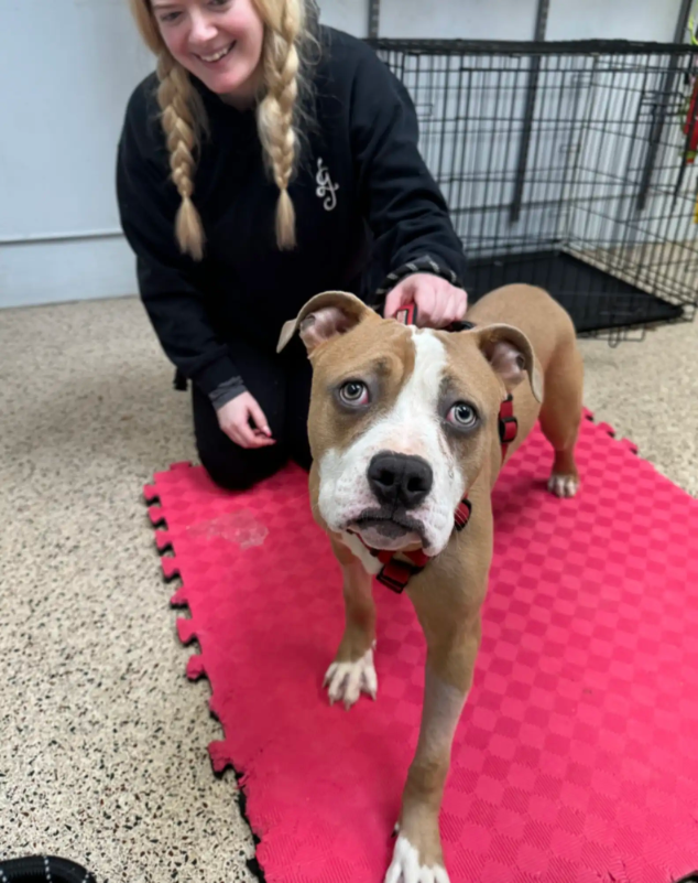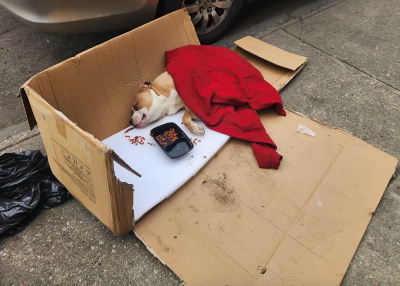 Inside was a white-and-tan pit bull, barely able to move. His body and legs were stiff, leaving him able to lift only his head. Gently, the worker freed him from the bag, laid him on a piece of cardboard, covered him with a blanket, and called for help.