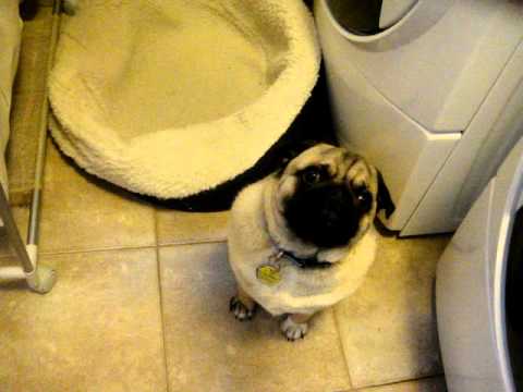 The question is: Why does he sleep away from his people? He should not be exiled to a cold laundry room. Dogs (especially pugs) love their humans and want to be close!!!