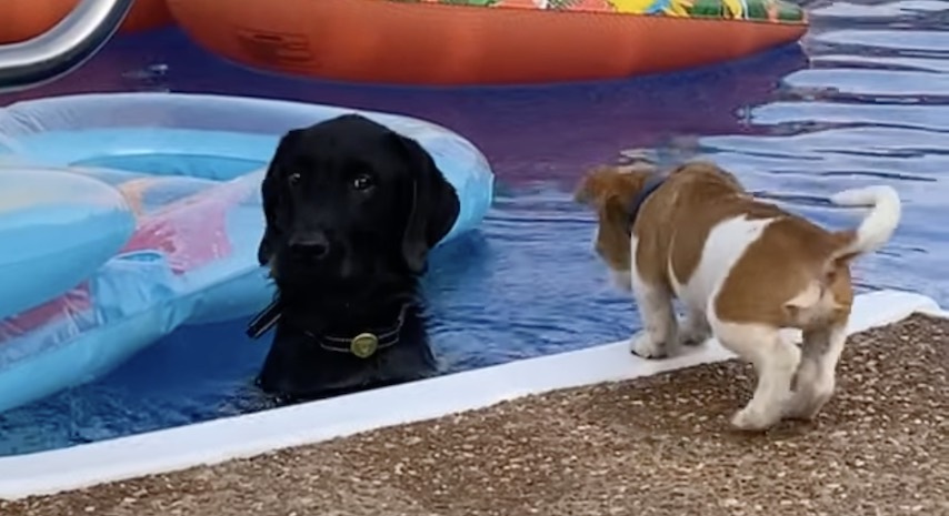 It’s both funny and a good reminder that pets need just as much poolside supervision as children! And we’re pretty sure that cranky old Rue will be watched more carefully around the puppy from now on until she accepts the pup into the pack.