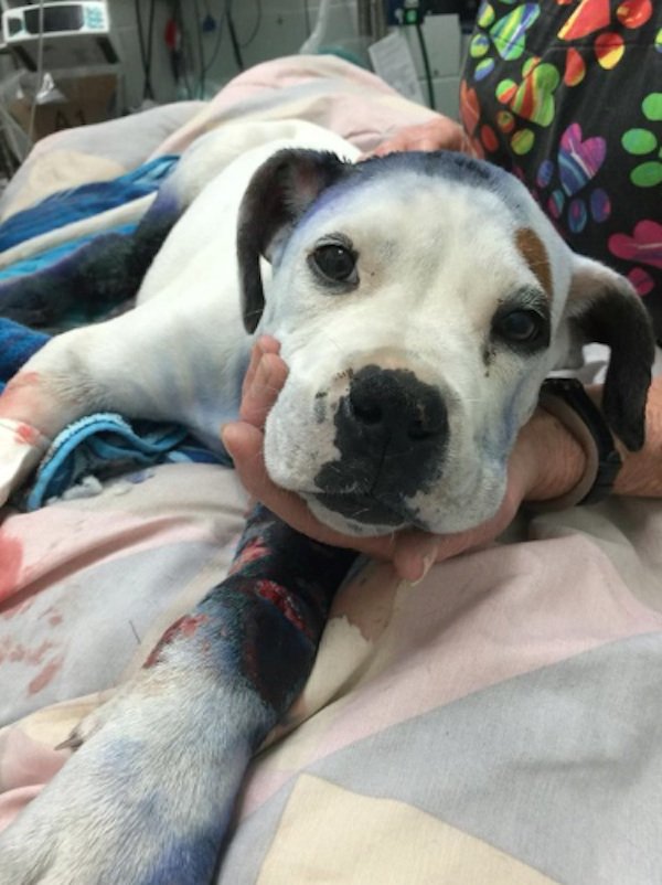 “Desperately need your help! We have a 3-4 mth old boxer pup that was spray painted, shot in head, and drug behind a car. We were able to get him to a vet just to stabilize him. Could y’all please take him to save his life?”