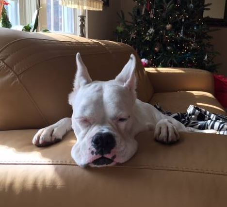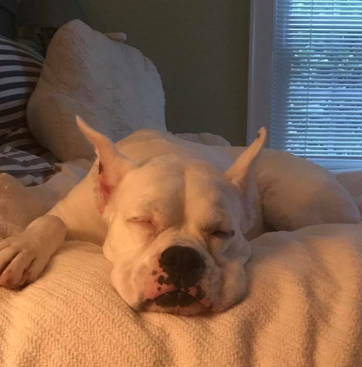 This all-white boxer has just a smattering of black spots around her nose and is the cutest thing. We’re so happy she found her forever home with parents who dote upon her and now can communicate at her level in a special way.