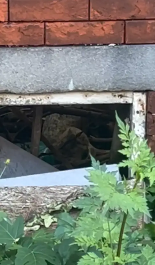 Peering through a basement window, Bell finally saw Lucky — trapped deep inside a pile of debris. The entire floor of the home had caved in, leaving Lucky stranded in the basement, surrounded by jagged wood and broken bricks.